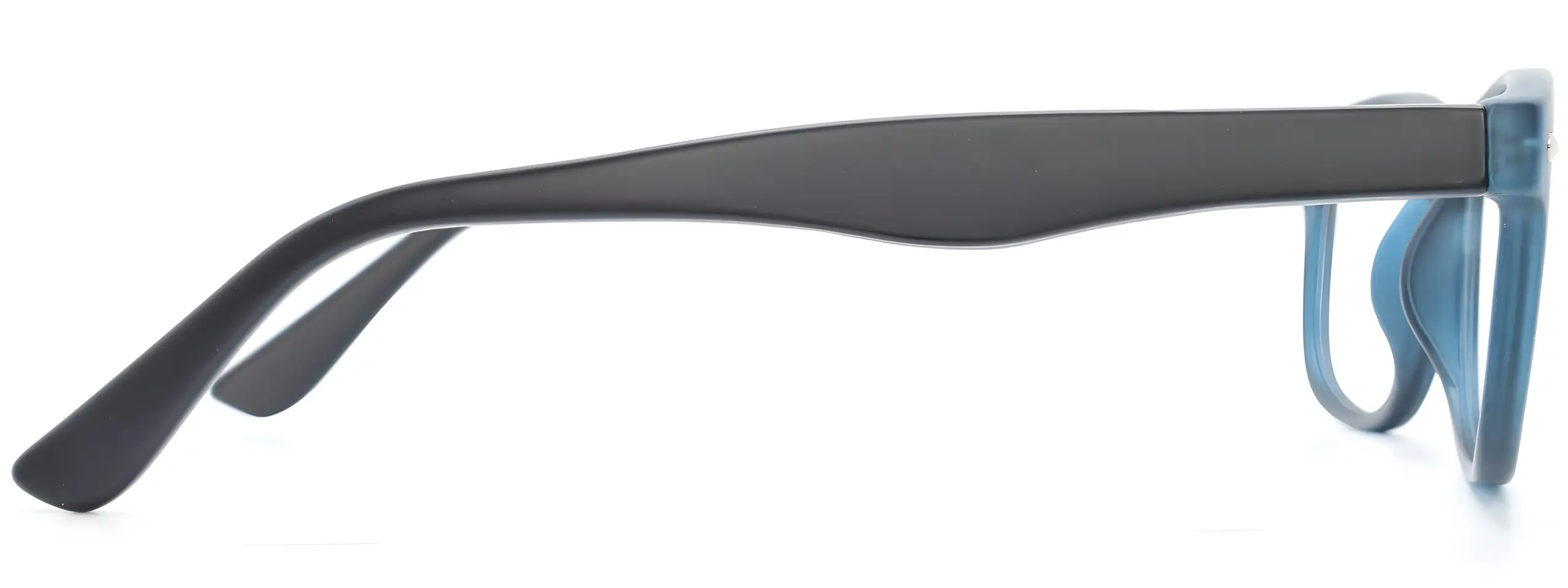 - Frosted teal blue acetate front with matte dark grey acetate arms