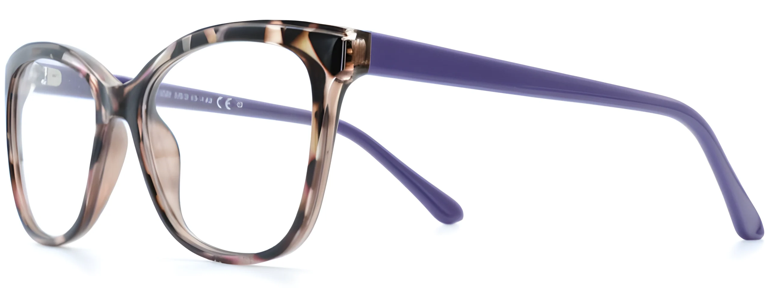 A-Z 310D Purple cat-eye glasses for women feature a brown frame with white and black spots, accented by bold purple arms. Lightweight and durable, perfect for custom prescription lenses or sunglass tints.