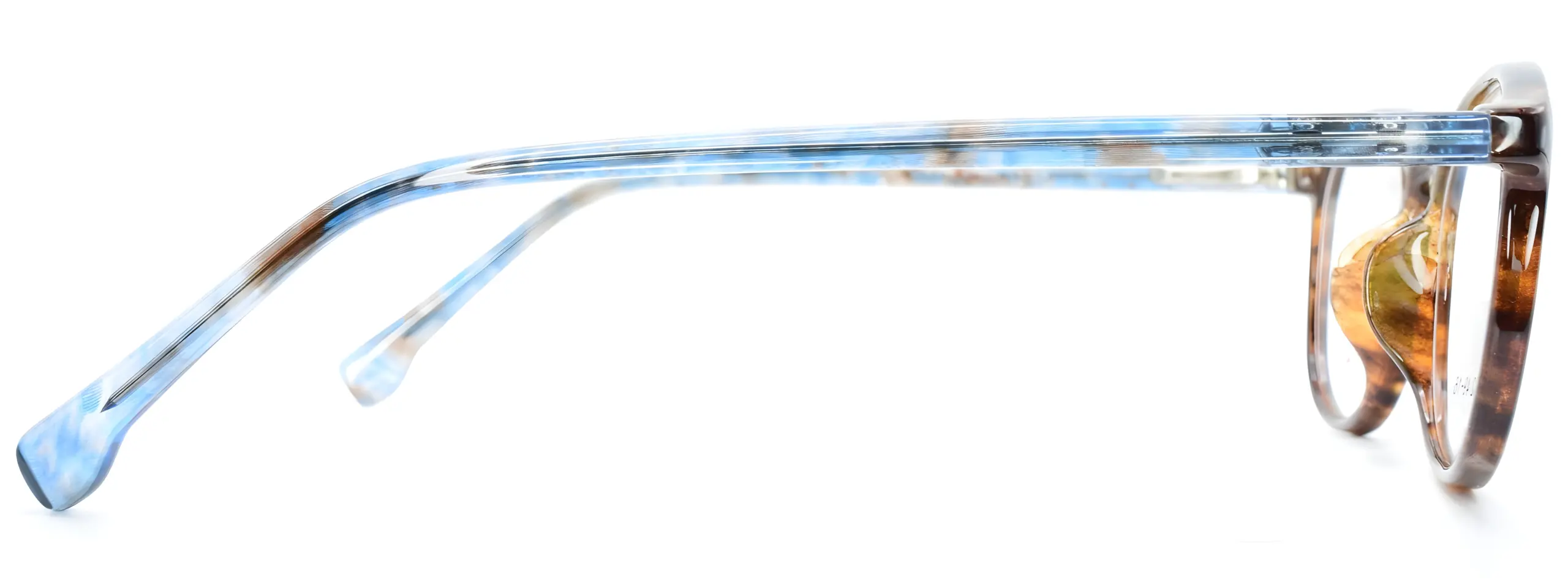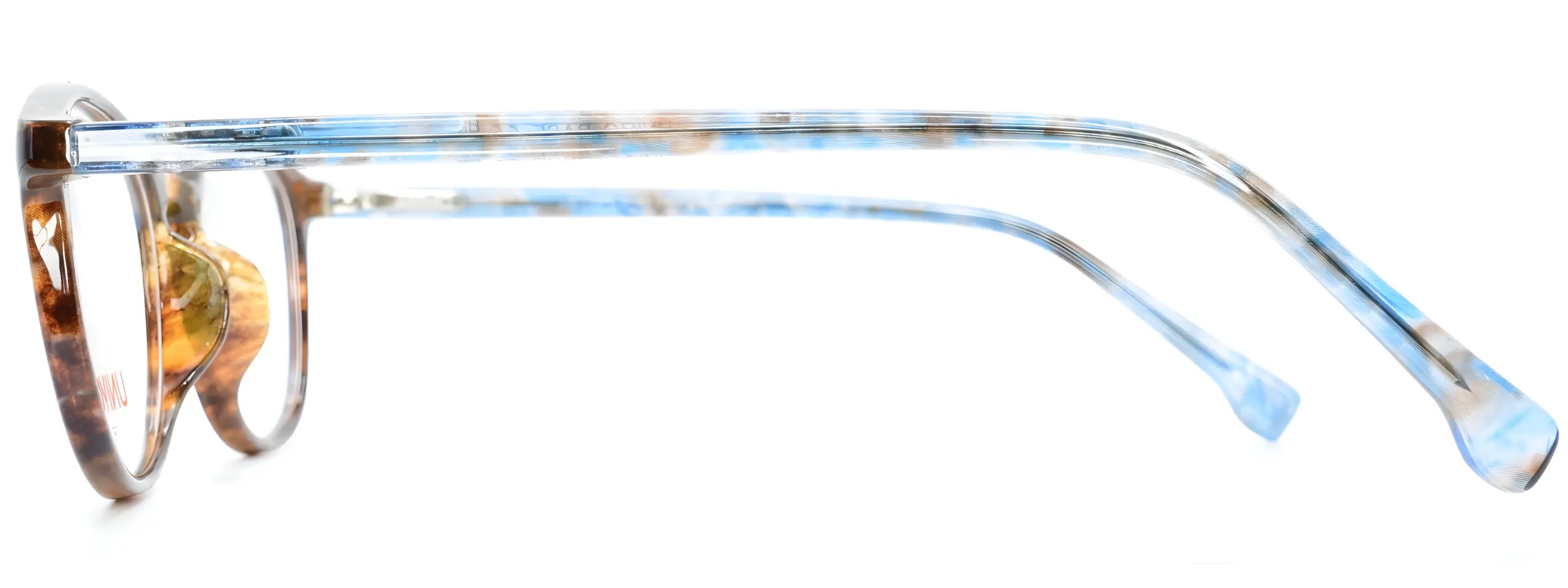 The Univo Base 0135 Brown glasses feature a glossy acetate round frame in a rich warm tortoiseshell pattern with deep amber and dark brown tones. Slim translucent blue and brown marbled acetate temples add an unexpected and striking contrast to the warm front.