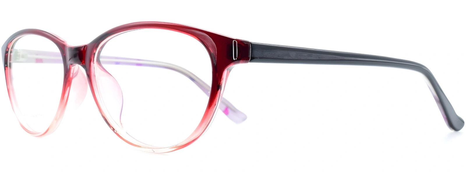 Univo Base UB018 C2 Glasses feature a red-to-clear gradient cat-eye frame with black temples. Frame size: 51-17-140. Lightweight and feminine, ideal for smaller to medium face shapes. Customise with prescription or non-prescription lenses and a choice of coatings.