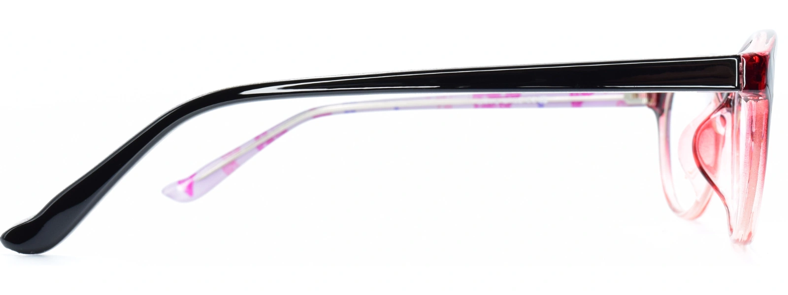Its glossy surface and contrasting black temples bring definition to the frame, giving it a bold yet balanced character. The blend of red tones with transparent edges creates a soft transition that flatters most complexions.