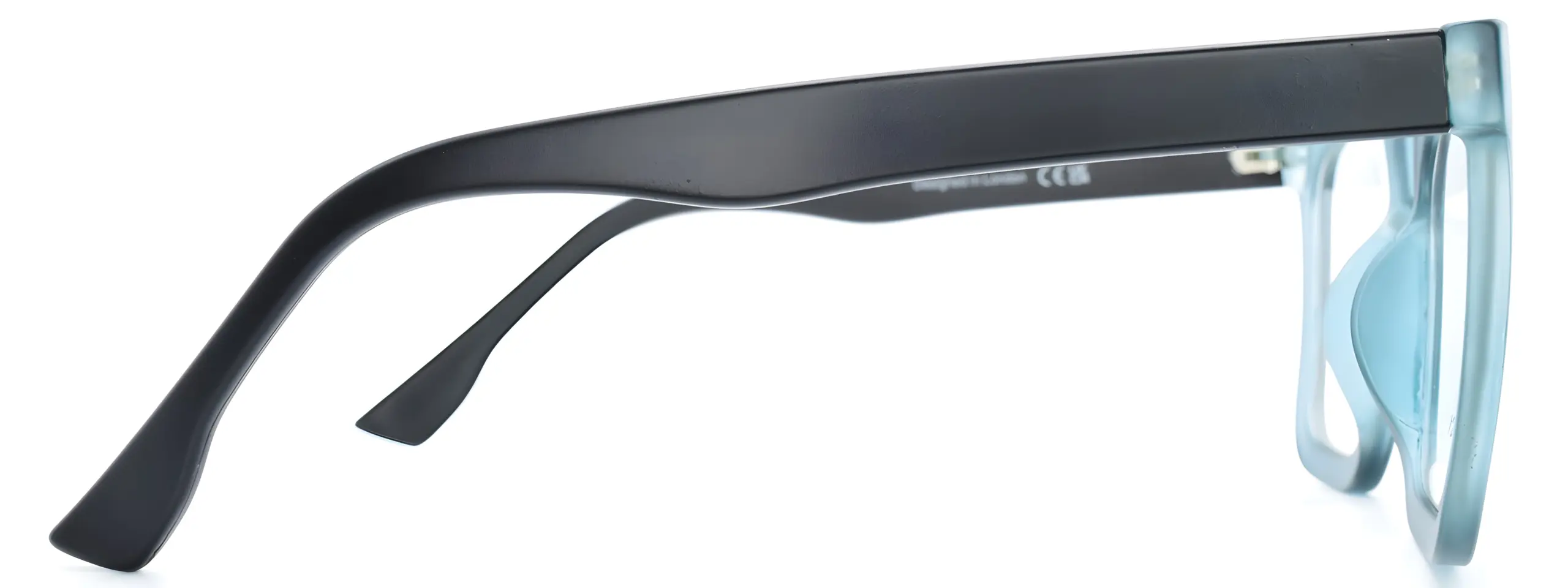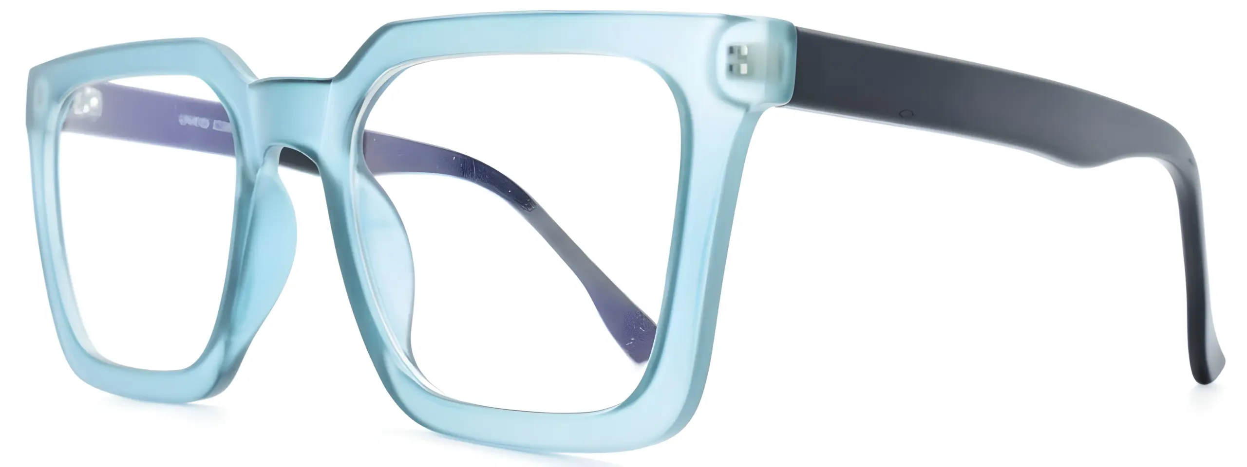 The Univo Core 5765 blue clear glasses feature a chunky square frame in a blue acetate, paired with contrasting matte black temples for a two-tone look that really stands out. The thick frame and clean square shape give these glasses a strong, confident character.